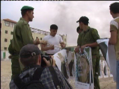 Die Vorbereitungen für Arafats Beerdigung laufen. Im Innenhof übt eine Garde den Paradeschritt - immer und immer wieder. An einem Seil werden von Offiziellen Arafat-Plakate befestigt, die aufgereiht wie an einer Wäscheleine über der Mukata wehen. Hier am Westeingang von Arafats Amtssitz haben sich nur wenige Journalisten versammelt. Kai Wiedenhöfer und sein Kanadischer Kollege Ethan Eisenberg sucht nach einem besonderen Motiv - eines das sich von den Dutzenden Shots der zahlreich angereisten